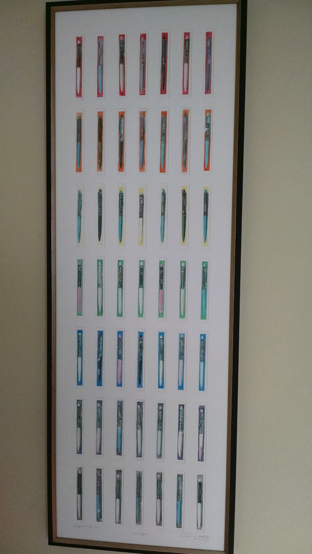 Pens--49 individual monoprints mounted as a collection--wood frame with non-reflective glass--framed sized ~22"x62" $1500